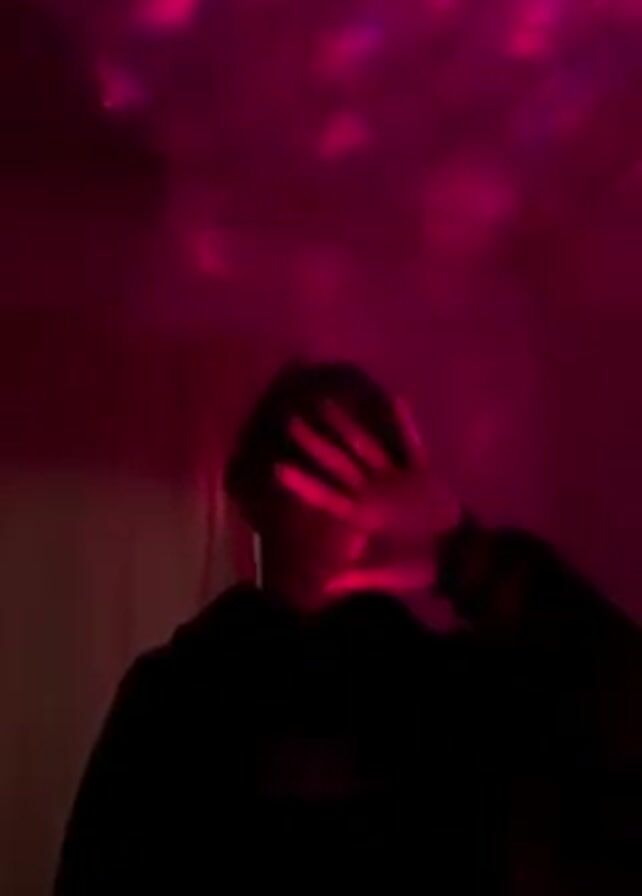 person standing in a room with magenta lighting. They are wearing a dark hoodie with white text. The person holds up their hand in front of their face. The magenta light projects patterns on the ceiling. The camera then focuses on the magenta lighting pattern on the ceiling. There is music playing in the background.