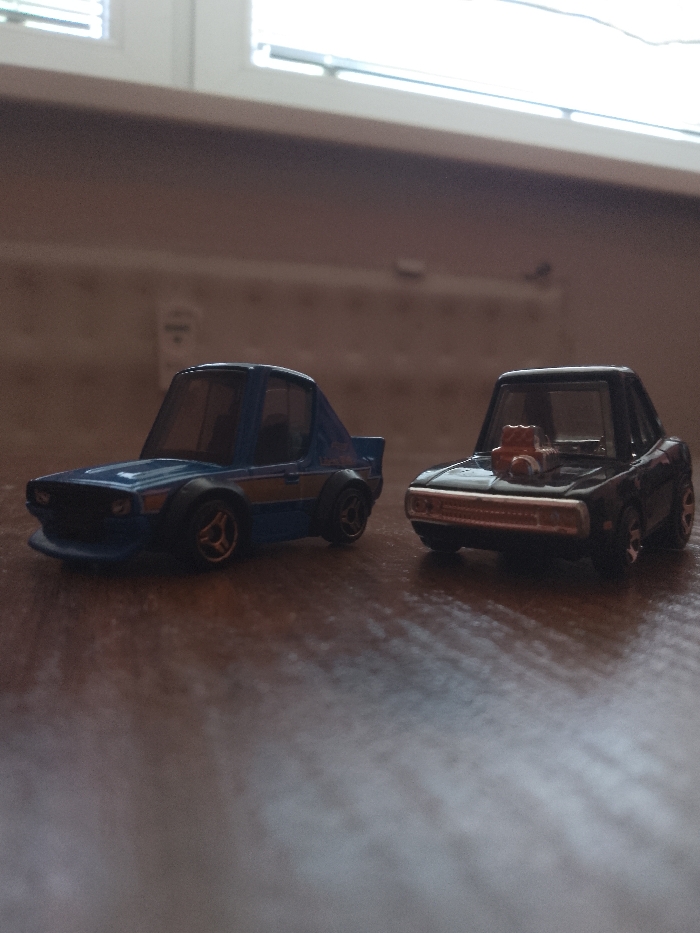 - "The scene, located in the city of Levice, Slovakia, depicts two stylized toy cars positioned on a dark brown, smooth surface, likely wood or laminate" by FM-PAQjG2, licensed under CC BY 4.0
