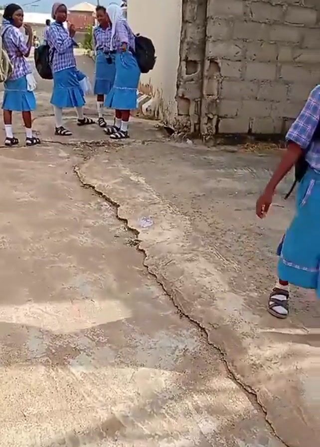 group of school girls in uniform, wearing headscarves, laughing and talking. They are standing on a paved road that is cracked and damaged in places. Other people walk along the road. The surroundings are buildings with brick walls and some foliage. The overall impression is that the environment is urban and the girls are in a jovial mood.