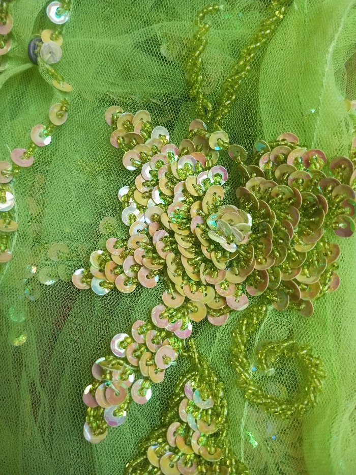 - "A close-up shows a light green fabric adorned with intricate beadwork and sequins" by FM-11lNF3, licensed under CC BY 4.0