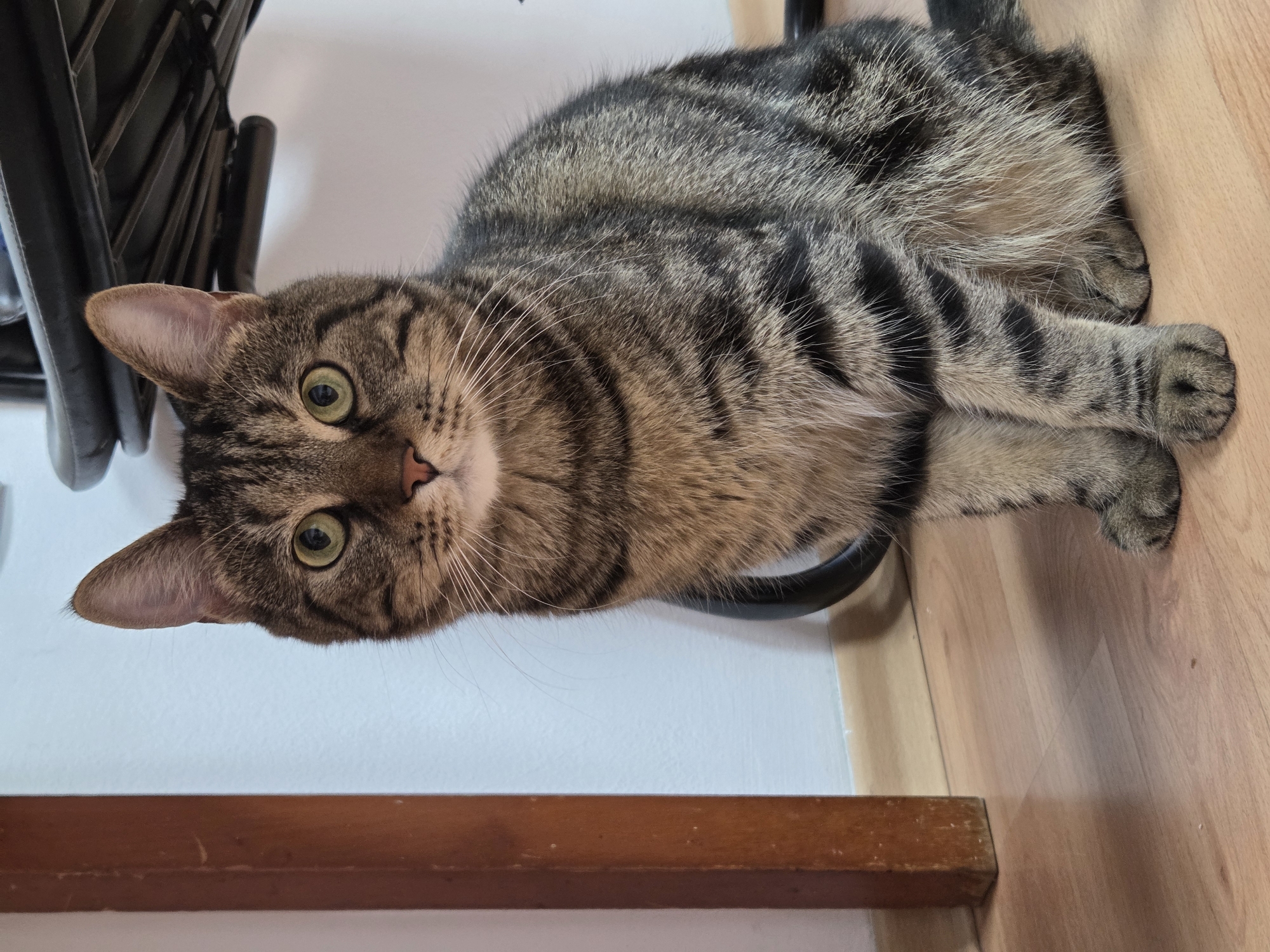 A domestic short-haired cat, exhibiting a mackerel tabby fur pattern with dark brown and black stripes over a lighter brown and gray base, is depicted sitting upright on a light wooden floor. The cat faces directly towards the viewer, displaying light green-amber eyes, a pink nose, and prominent white whiskers. Its ears are erect. In the background, a white wall with a white baseboard is visible. To the far left, a vertical, light brown wooden object (possibly a furniture leg or frame component) is present. To the right and partially above the cat, a dark, curved or tubular object, indicative of furniture (e.g., chair leg or base), is discernible. The setting is indoors. The location is identified as the city of Burgas, Bulgaria.