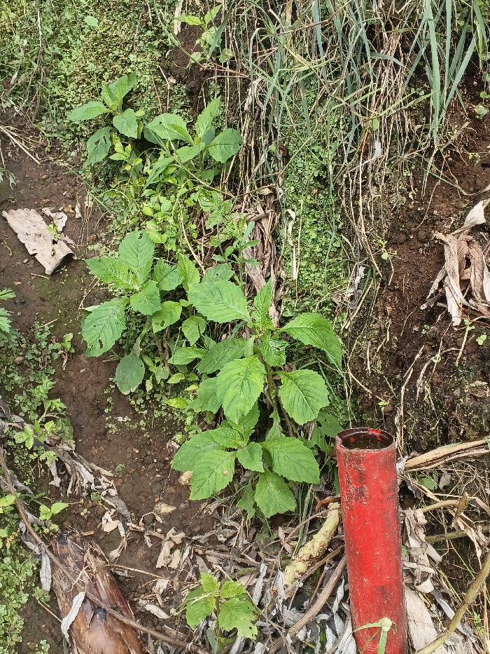 A patch of overgrown vegetation dominates the scene. Lush green plants with broad leaves grow densely from the brown earth. Drier, straw-like grass and dead banana leaves are scattered around. A red metal pipe stands among the foliage, adding a man-made element to the natural setting. Small green plants cover the soil, creating a verdant ground cover.