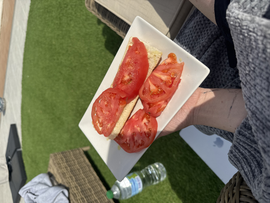 The image displays an outdoor scene, likely a private garden or patio, situated in Fuente Álamo de Murcia, Spain. A person's arm and lap are visible in the foreground, covered by a grey, knitted blanket or garment. The person is holding a white rectangular plate containing food. The plate holds two pieces of bread or toast, each topped with slices of red tomato, seasoned with visible white crystals (likely salt), and glistening with olive oil. Additionally, three irregular slices of red tomato are positioned directly on the plate. A faint linear mark is present on the person's left wrist. Partially visible beneath the blanket on the person's lap is a silver or white laptop with an Apple logo. To the left, a transparent plastic water bottle with a light green cap rests on a manicured green lawn. A dark brown wicker outdoor chair or lounge is positioned on the left, with a grey fabric item draped over it. A portion of a similar chair is visible on the right. The background consists of the green lawn, extending to a light-colored paved area. On the paving, a dark, flat, square object (possibly a furniture base) and a small, decorative pot are present. The scene is illuminated by bright natural sunlight, indicating daytime.