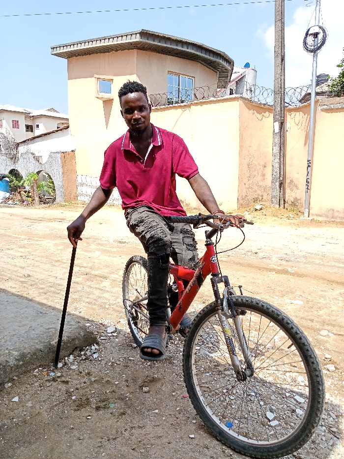 An outdoor, daylight scene in a residential area of Lekki, Nigeria. A male subject, appearing to be an adult, is positioned in the foreground, seated on the crossbar of a red mountain bicycle. He has dark skin, short dark hair, and a short beard. He wears a maroon short-sleeved polo shirt, dark distressed jeans, and dark slide sandals. His gaze is directed towards the camera. He holds a slender, dark rod or stick vertically in his right hand, its lower end resting on the unpaved ground next to a concrete curb. The bicycle is red, equipped with front suspension, and exhibits signs of wear. The ground is an unpaved dirt and gravel surface with scattered debris. In the background, a two-story residential building with light beige walls and a dark, corrugated roof overhang is prominent. It features multiple windows, including a large rectangular window and a smaller, angular one. The property is secured by a low wall topped with barbed wire. To the left, additional residential structures are visible behind a white decorative fence with arched openings. To the right, a utility pole stands vertically, densely wrapped with cables at its upper section. Adjacent to it is a lighter pole with the characters "SP 167" or "SP 67" vertically inscribed in dark lettering. The sky is clear blue.