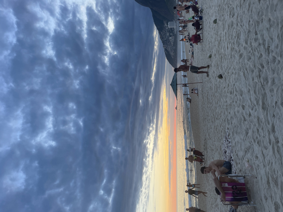 A beach scene at sunset with numerous people. Some are sitting in chairs, others are standing or walking near the water's edge. An umbrella is visible along the shoreline. The sky transitions from dark, cloudy hues to a vibrant yellow and orange at the horizon. A mountain can be seen on the right side of the picture.