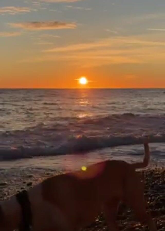 A scenic shot captures a sunset over the ocean, with a dog in the foreground