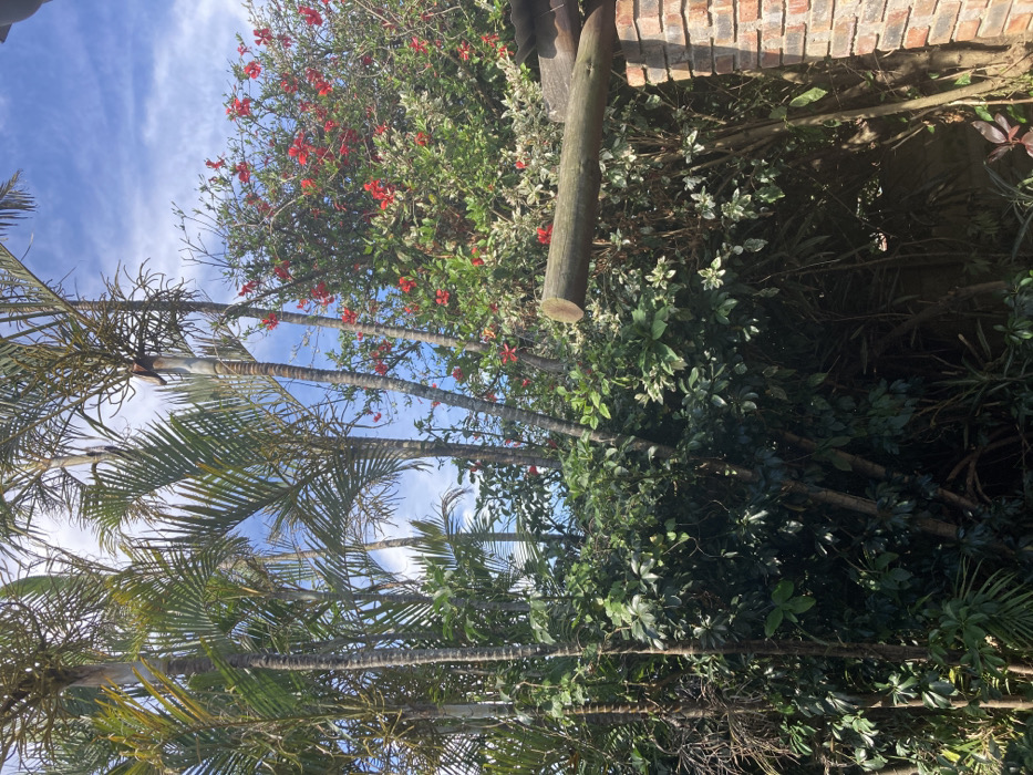 The image displays a vibrant outdoor scene in East London, South Africa, characterized by dense vegetation under a blue sky with scattered white clouds. Numerous slender palm trees, some with visible trunks, rise vertically throughout the frame, their green fronds partially obscuring the sky. A large, dense shrub featuring numerous bright red flowers, consistent with hibiscus, and variegated green and white foliage, occupies the mid-right section. The foreground and mid-ground are filled with a variety of lush green shrubs and undergrowth. In the lower right corner, a partial brick column, constructed from orange-brown bricks with dark mortar, is visible. Extending horizontally from this brickwork is a light-colored, cleanly cut wooden beam, indicative of a pergola or similar outdoor structure. No human figures or explicit actions are depicted. The scene is illuminated by natural daylight.