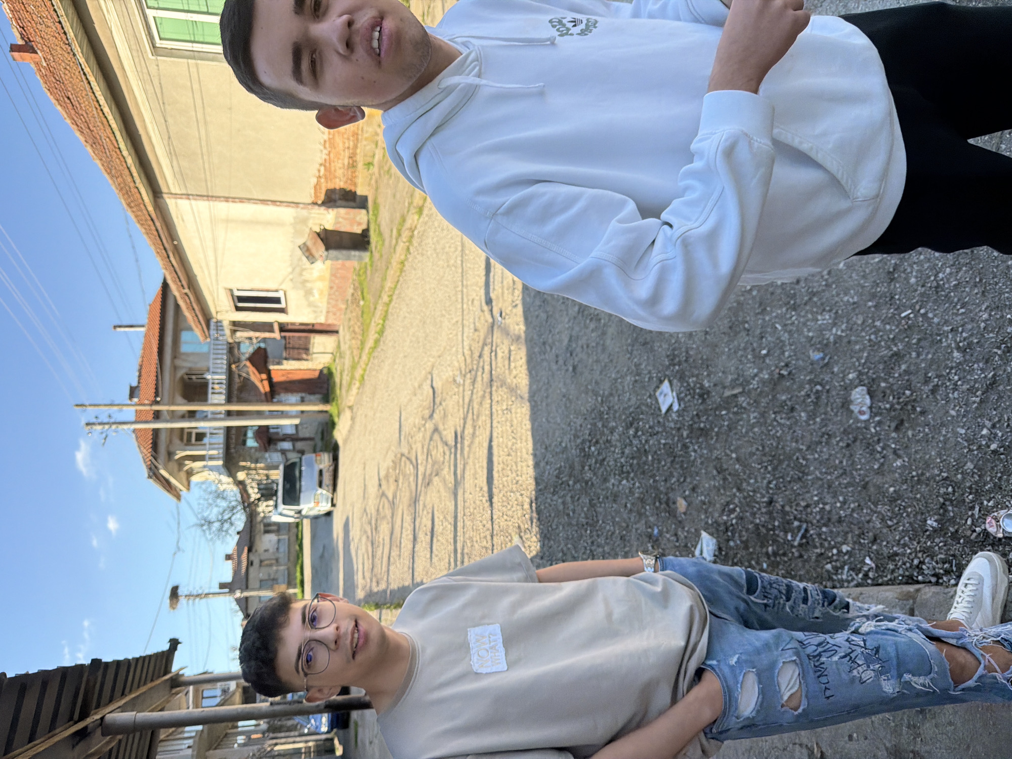 Two young men pose for a photo on a street in Dolni Dabnik, Bulgaria. One man wears a white hoodie and black pants, while the other sports a beige t-shirt, ripped jeans, and glasses. The setting includes buildings typical of the town, with visible rooftops and facades. A parked white van and utility poles are discernible in the background. The sky is blue, indicating a sunny day. The ground appears to be asphalt with scattered debris.