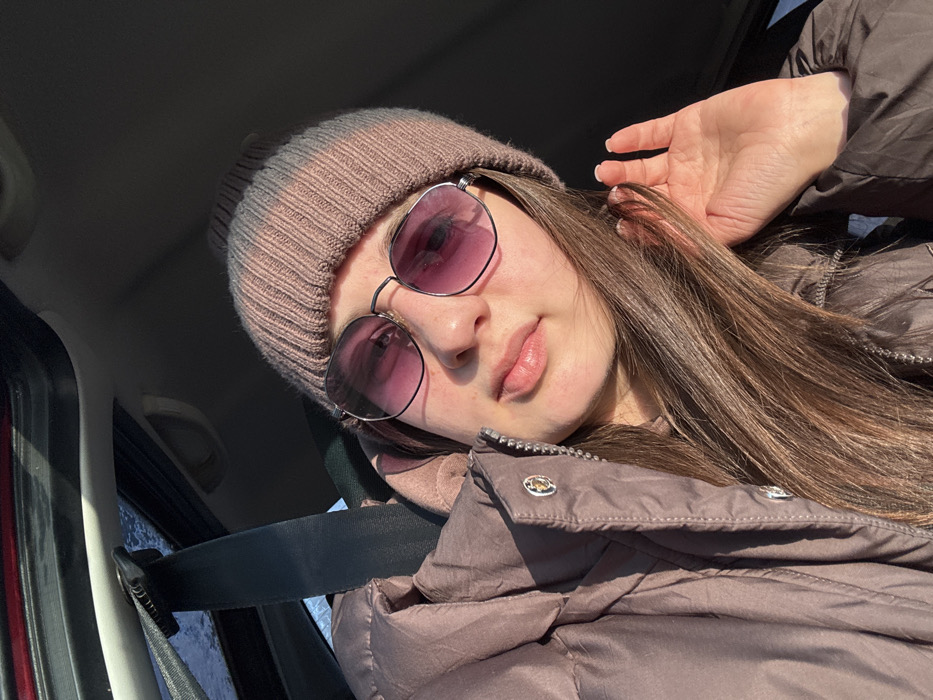 A young woman wearing sunglasses and a knit hat poses inside a car. She's wearing a brown puffer jacket and a seatbelt. Her hand is raised near her head. The lighting is bright, creating strong shadows on her face and clothing. Her long brown hair is shiny and reflects the light. The car's interior is visible, including the door frame and a glimpse of the outside.