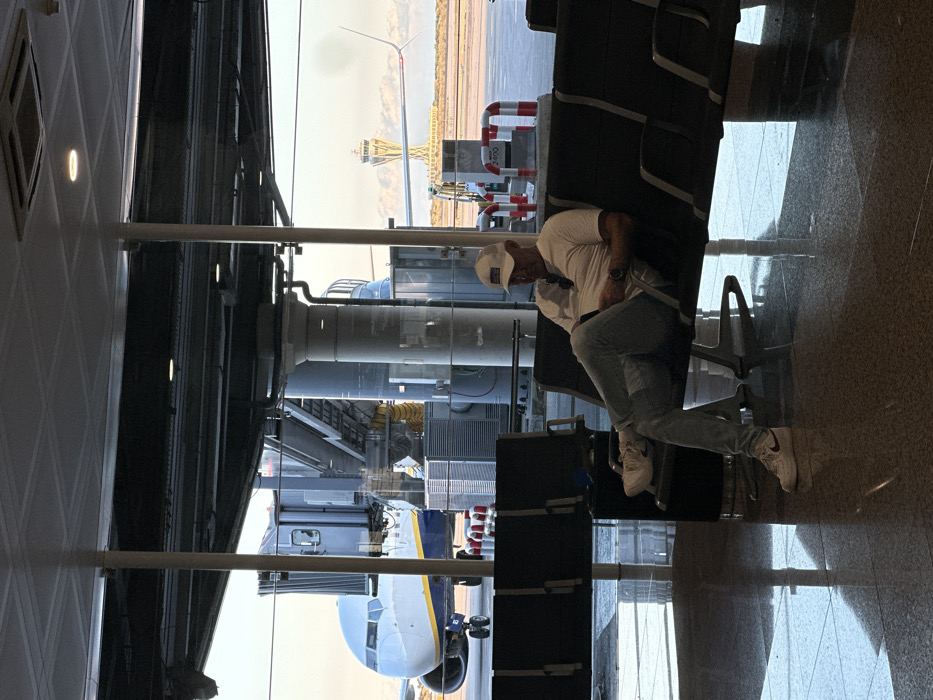 The image captures an airport waiting area at Barcelona-El Prat Airport in El Prat de Llobregat, Spain