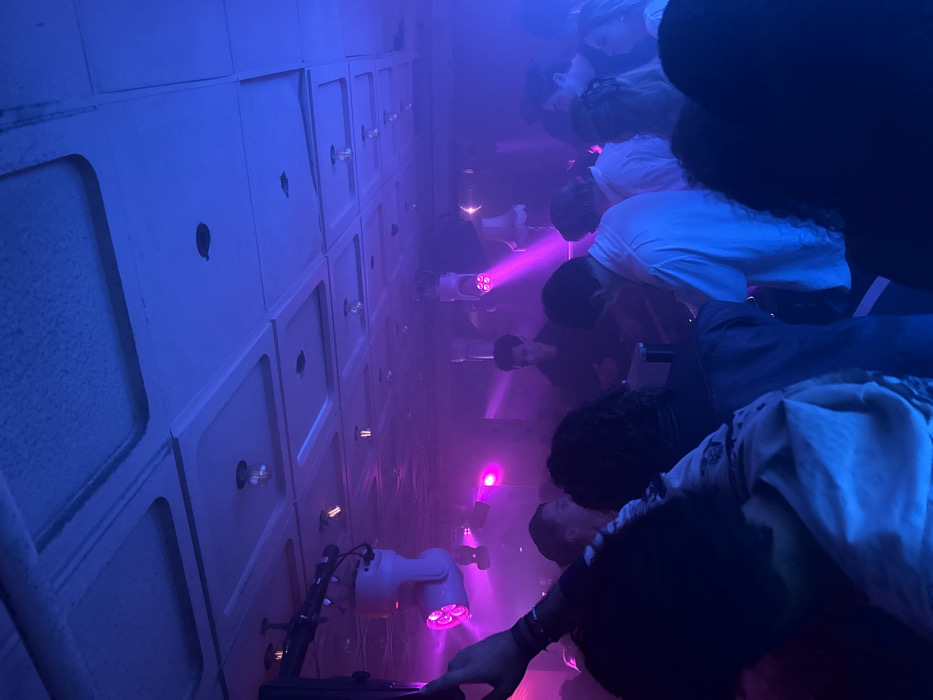 The image captures an indoor event, identified as being in Paris, France, characterized by a crowded atmosphere and vibrant artificial lighting. The scene is enveloped in a hazy fog or smoke, predominantly illuminated by strong blue and magenta light beams originating from multiple stage lights. The ceiling is white, featuring a coffered design with numerous square or rectangular panels, each containing a small, recessed light fixture. Several larger, white moving head stage lights are mounted to the ceiling or a truss structure, projecting colored light downwards. In the mid-ground, a male figure with dark hair, wearing a dark shirt, stands behind a console or table, appearing to operate electronic equipment. To his right, a cluster of individuals is visible, including one person in a white shirt bending forward and another with dark hair observed from the side. In the immediate foreground, the back of a person with dark, curly hair is visible, wearing a light-colored top. Their right arm is raised, revealing a wristband around the wrist. The overall scene depicts a gathering of people interacting within a dynamic, nightclub-like environment.