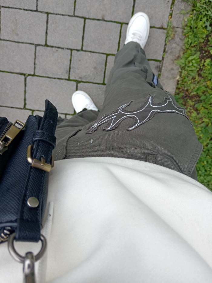 The image depicts a first-person, downward-facing view of an individual's lower body standing on a paved surface. The person is wearing a light-colored upper garment (likely white or off-white), olive green cargo pants, and white sneakers. The right pant leg features a dark, flame-like appliqué with prominent white stitching, along with a few small white scuff marks or specks. A dark blue or black textured shoulder bag with a gold-toned buckle, a silver-toned snap button, and a silver-toned D-ring and clip is visible hanging on the left side of the person's body. The ground consists of rectangular grey stone or concrete pavers arranged in a stretcher bond pattern, with green moss visible in the crevices between them. To the right of the paved path, a strip of green vegetation, including grass and small plants, borders the walkway. No specific landmarks or unique features are present to pinpoint an exact location within the city of Dresden, Germany; the environment is consistent with a generic urban or park pathway.