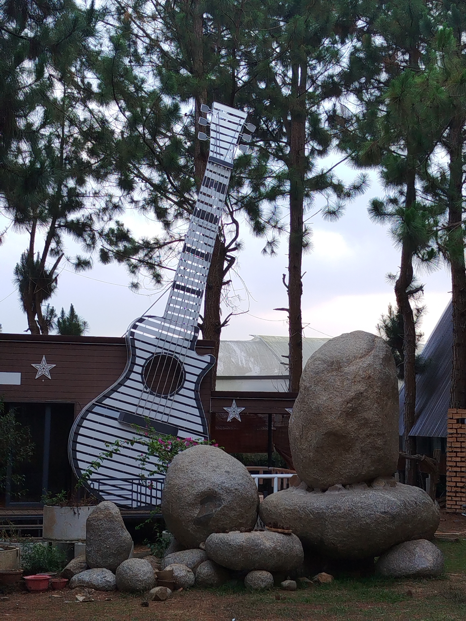 guitar-shaped sculpture and a rock sculpture in Krăng Chớ, Vietnam. The guitar sculpture is large, striped in white and grey, and stands in front of a brown building with a star decoration. The sculpture is positioned amongst pine trees. The rock sculpture is composed of several large, grey rocks stacked on top of each other. It is situated on a grassy area with other smaller rocks scattered around it. The sky is overcast. The scene is outdoors during the daytime. Other buildings are visible in the background. No people are visible in the image.