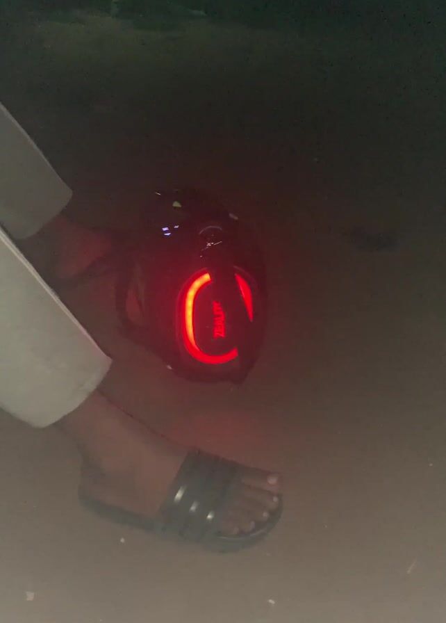 Here's a forensic description of the video: The video shows a pair of legs, likely belonging to a person, visible from the knees down, wearing white pants and black Adidas sandals. To the right of the legs, there is a black Zealot S16 Bluetooth speaker with illuminated, color-changing lights. The lights cycle through red, purple, yellow, and blue. The background is dark, and the ground appears to be dirt or sand. No specific actions or interactions are visible other than the changing colors on the speaker.