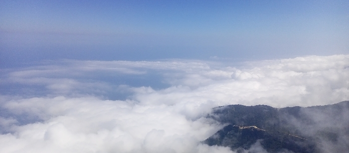 This image depicts an aerial or high-altitude view overlooking San José de Galipán, Venezuela. The scene is dominated by a vast expanse of white, textured cumulus clouds, forming a sea-like layer across the middle and lower portions of the frame. Above this cloud layer, approximately the upper third of the image shows a clear, light blue sky, indicating an elevation above the local weather patterns. In the far distance, a faint, lighter blue-gray horizontal band is visible beneath a hazy cloud layer, consistent with a body of water, likely the Caribbean Sea. In the lower-right quadrant, a range of dark green, mountainous terrain emerges from beneath and through the clouds. These mountains are densely covered with vegetation. On a prominent ridge within these mountains, a cluster of small, light-colored structures, possibly buildings or infrastructure, is visible. A faint, winding path or road can also be observed along this ridge. No individuals, specific actions, or direct interactions are visible within the frame. The overall environment suggests a high-altitude natural landscape with limited human development visible on the exposed mountain ridges.