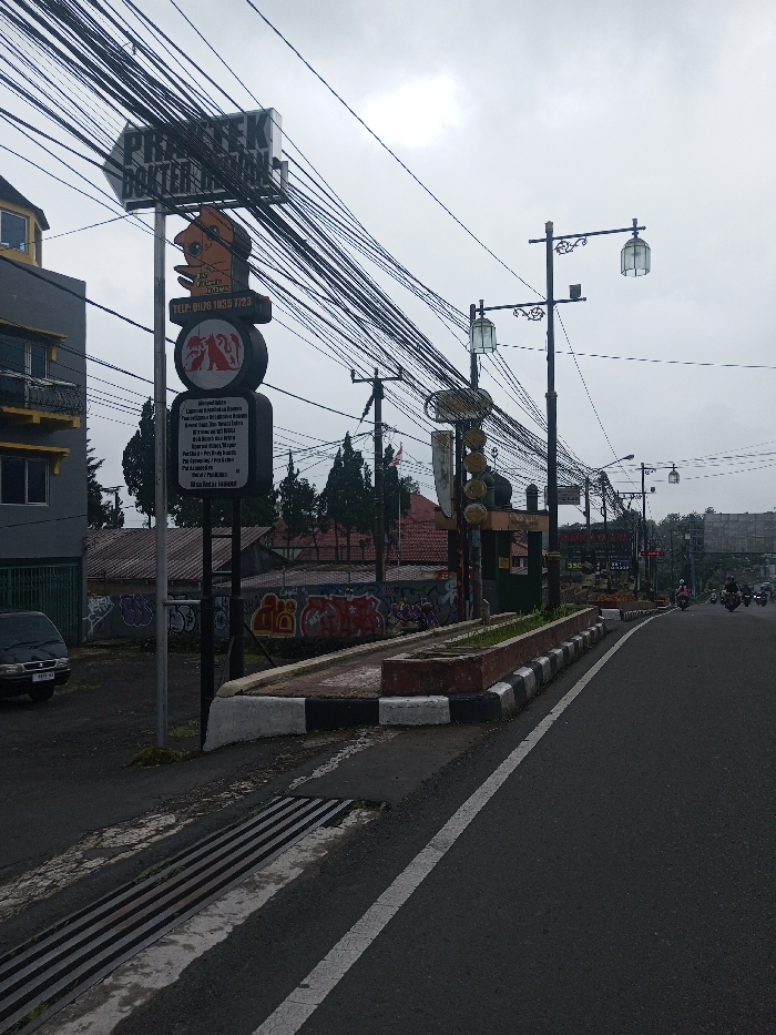 A street view features a tangle of overhead wires dominating the sky. A tall sign with directional information and cartoon graphics stands to the left. The road is asphalt with white line markings, and a raised median with vegetation runs along the street. The sky is overcast, and a few motorbikes are visible further down the road. Graffiti adorns a wall in the background, partially obscured by trees.