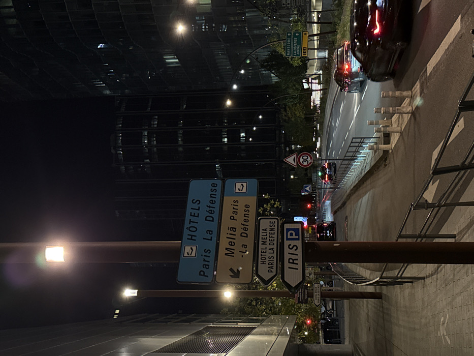 This nighttime image captures a street scene within the La Défense business district, located in Courbevoie, France