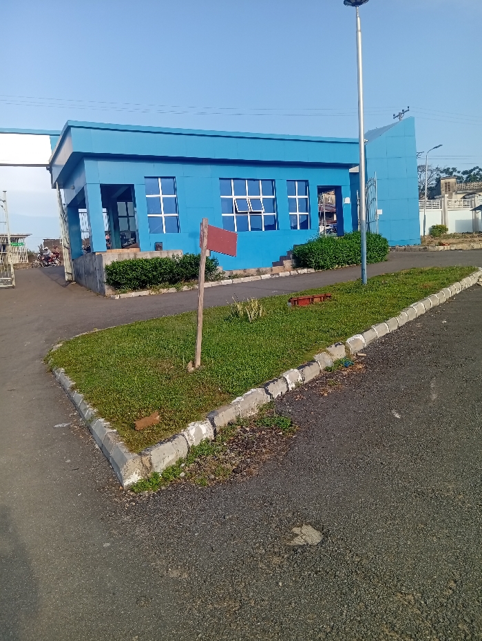 The scene is located in Okengwe - Obehira, Nigeria, under a clear blue sky. A bright blue, single-story building occupies the mid-ground, featuring multiple white-framed windows, one of which is partially open. Green shrubbery surrounds the base of this building. To its left, a partial view of an entrance archway with a white sign is visible, leading towards a background area containing indistinct human figures and small vehicles. A tall, silver-colored pole equipped with a solar-powered streetlamp stands to the right of the blue building. The foreground consists of dark asphalt pavement, showing minor wear and a small pothole. This pavement is bordered by a concrete curb separating it from a triangular grassy median. Within this median, a slender wooden post holds a small, rectangular reddish-brown sign, and an additional reddish-brown object rests on the grass near the curb. Distant structures, a white wall, and trees are visible in the far background on the right.