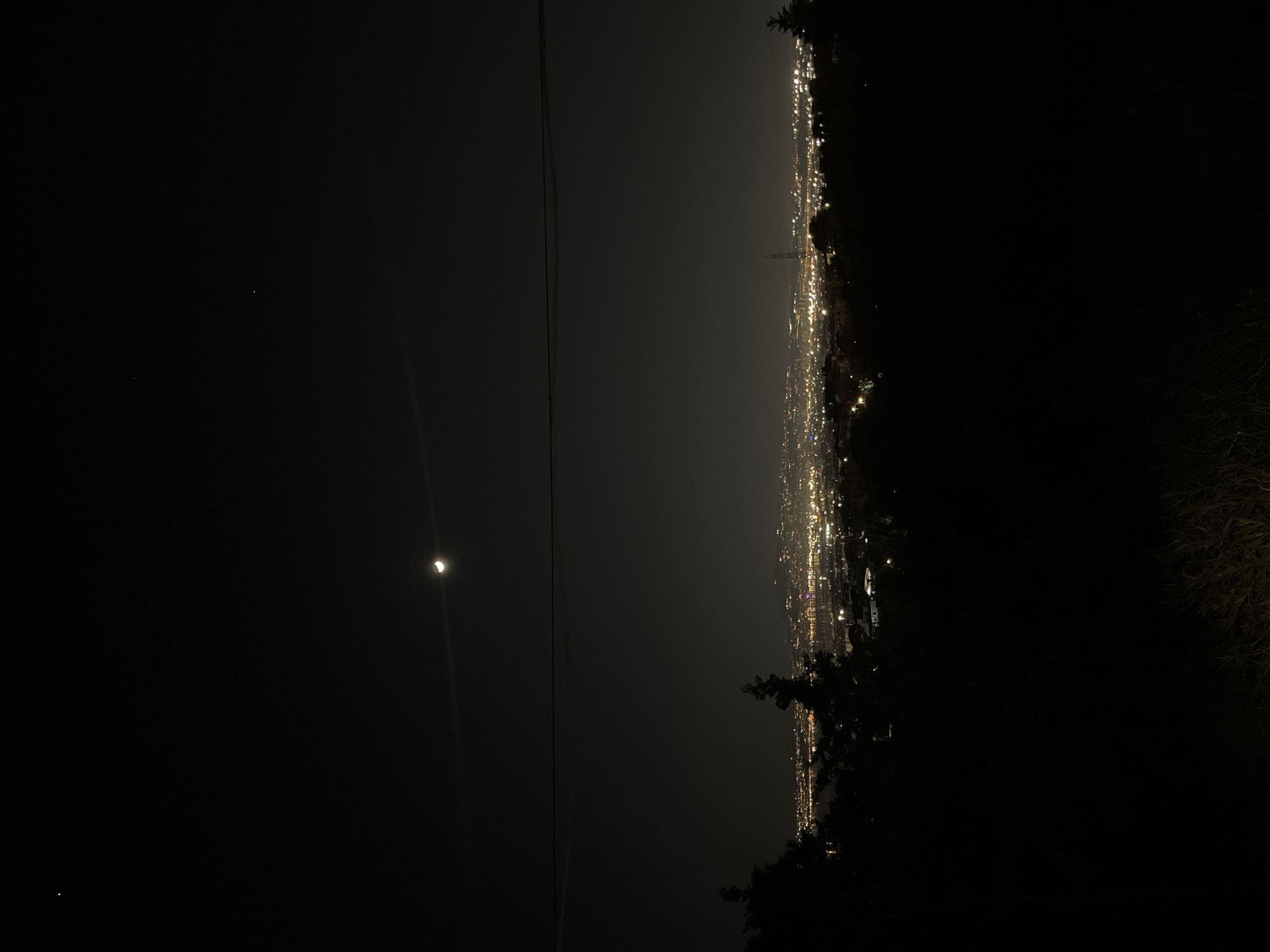 This nighttime panoramic image depicts a view overlooking the city of Ercolano, Italy, likely from an elevated position. The scene is dominated by a dark sky, featuring a prominent crescent moon positioned in the upper center, illuminated on its right side. Faint stars are visible, primarily in the upper left quadrant. A subtle, horizontal light streak, possibly a contrail, extends beneath the moon. A dark, thin horizontal line, consistent with a utility wire or cable, stretches across the upper mid-section of the frame. The midground is comprised of an expansive urban landscape characterized by numerous scattered, bright yellow and orange artificial lights, indicative of a city at night. This illuminated urban area extends across the entire horizontal mid-section of the image, suggesting a large populated area, potentially bordering a body of water which appears darker with scattered lights on the left side, consistent with the Bay of Naples. A distinct, dark-colored lattice transmission tower stands vertically within the illuminated city lights on the right-mid side. Buildings are discernible as light clusters and darker silhouettes against the glow. The foreground is largely obscured by darkness, revealing only the silhouetted forms of dense foliage, including trees and shrubs, which frame the lower and side edges of the view. No people are visible. No explicit actions or interactions are depicted. The environment is an outdoor, nighttime urban landscape observed from a distance.