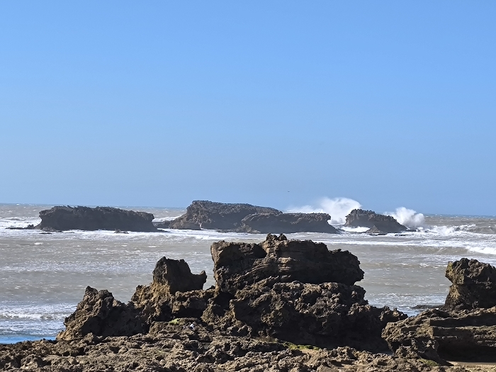 This image depicts a turbulent coastal scene in Essaouira, Morocco. The upper approximately 40% of the frame is a clear, light blue sky. The lower two-thirds are dominated by a choppy, grayish-brown ocean with numerous whitecaps and waves. In the mid-ground and distance, several dark, jagged rock outcrops or small islands are visible within the sea. Significant white spray is generated as waves actively break against these rocks, particularly against a cluster of formations towards the right mid-ground. The immediate foreground is comprised of large, rugged, dark brown rock formations, displaying complex textures and sharp edges. No individuals or man-made structures are present within the frame. The scene indicates clear weather with strong oceanic activity.