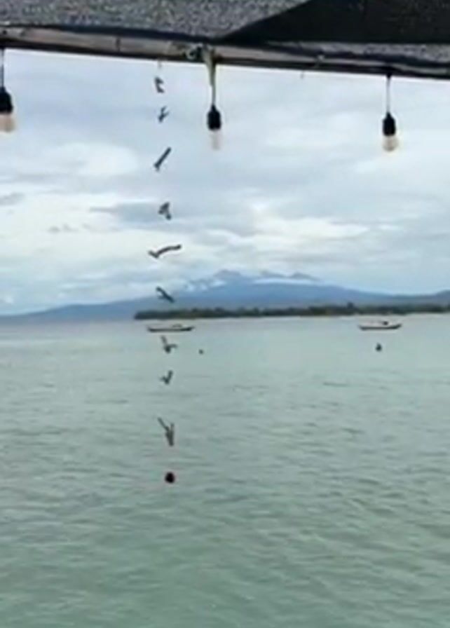 The scene unfolds from the vantage point of a partially covered pier or balcony. The camera is static, offering a view of a body of water stretching out towards an island with a mountainous backdrop partially obscured by clouds. The water is generally calm with a light blue-green hue. Several small boats are scattered across the water, with swimmers visible near one of them. A string of decorative driftwood hangs from the overhead covering, adding a touch of rustic charm to the setting. A single light bulb can be seen hanging from the canopy on each side of the frame.