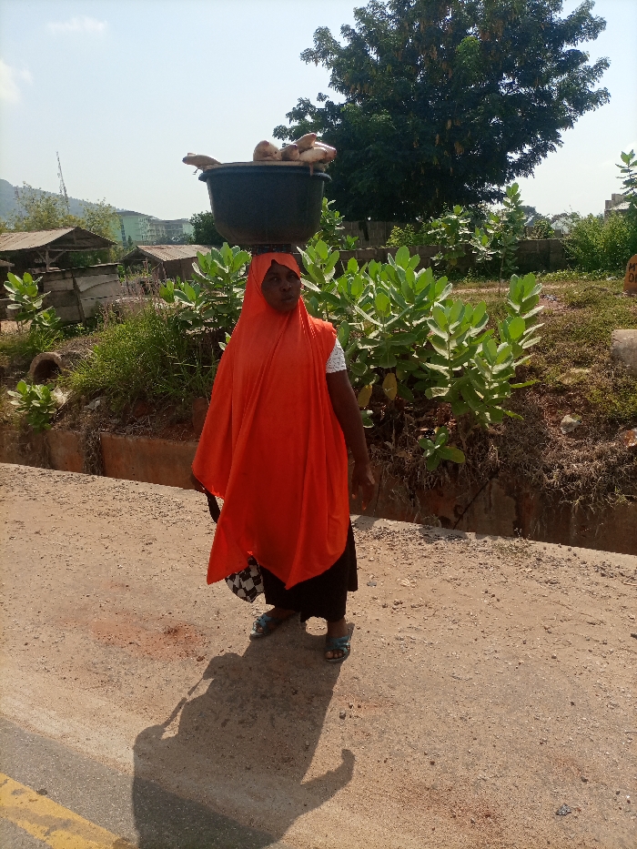 In Adankolo, Nigeria, an adult female stands on an unpaved road segment under bright daylight