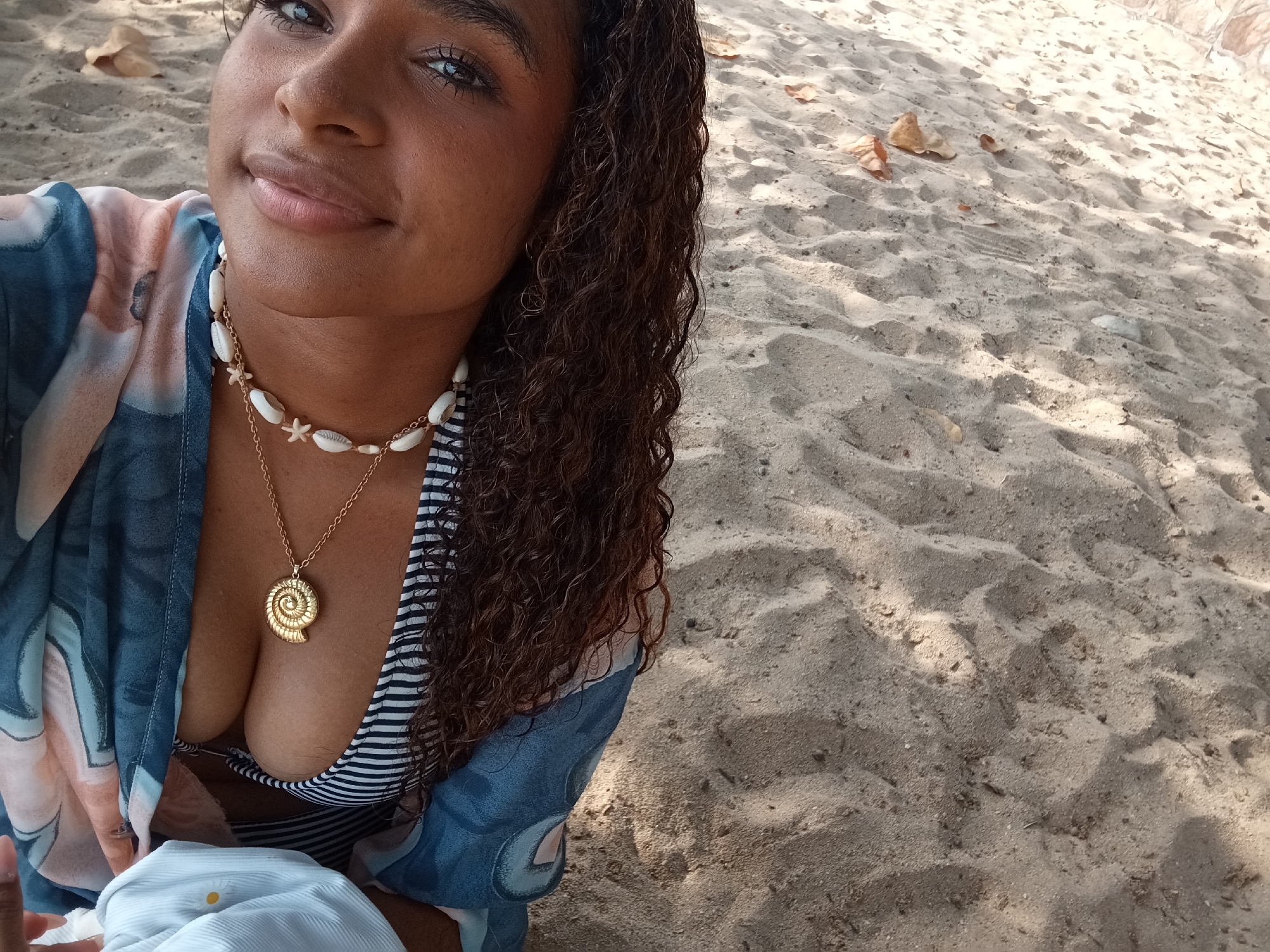 A medium-shot captures a woman on a sandy beach. She is wearing a blue and orange patterned cover-up over a striped bikini top, with a layered necklace of seashells and a golden seashell pendant. Her curly brown hair falls to her right. The background is a sunlit sandy beach with scattered leaves. Based on the location, this is likely a beach in or near Altagracia, Venezuela.