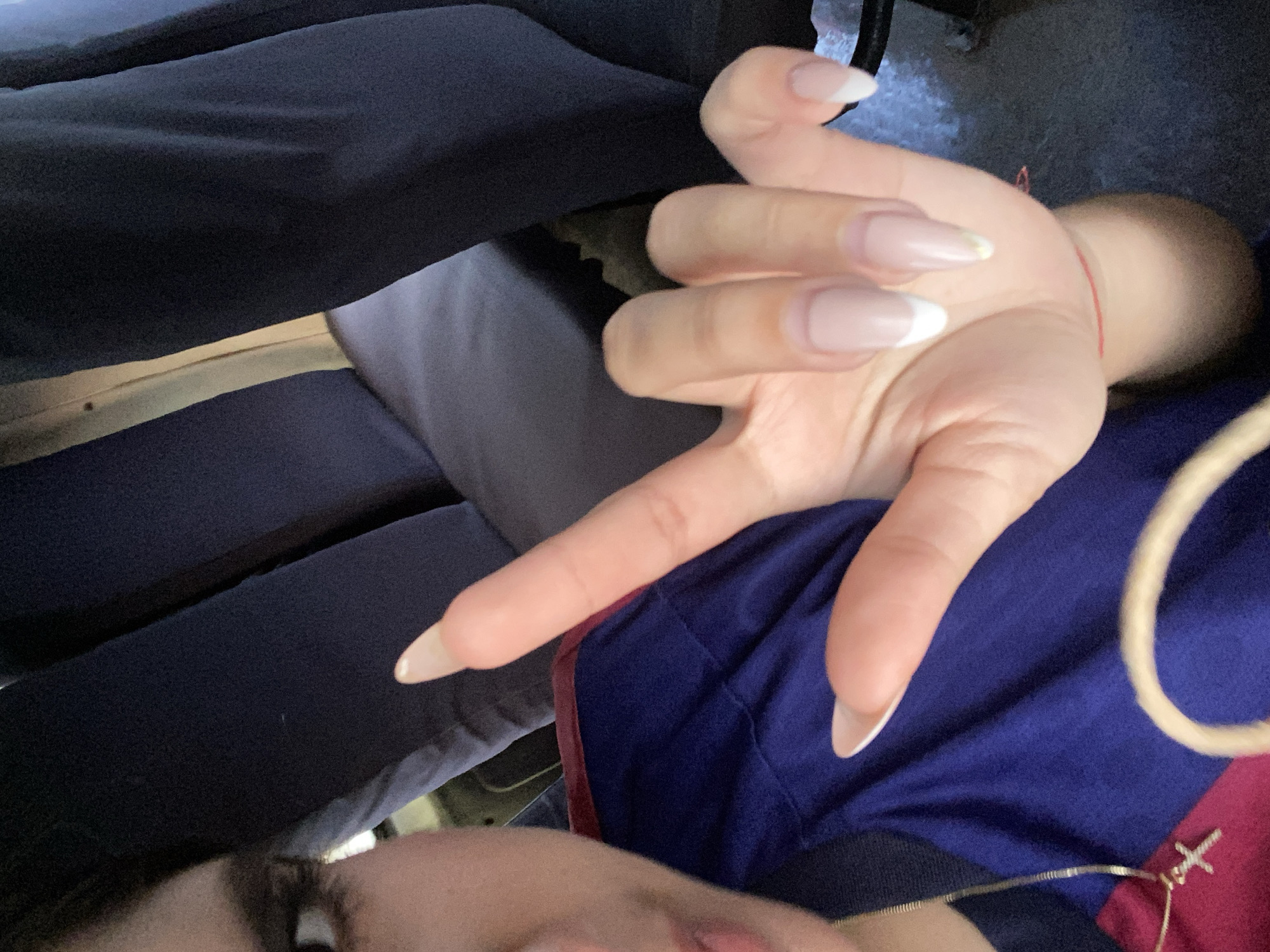 partial selfie of a person with light skin, focusing on their hand displaying long, manicured nails with a white French tip design. The person is wearing dark blue clothing and a thin gold necklace with a small cross pendant is visible. The background includes dark blue fabric which could be clothing or upholstery, and a glimpse of what appears to be an interior space of a car, based on the dark color, and the presence of what seems like part of a seat. There is no information in the image that indicates the specific location in the city of Porlamar, Venezuela.