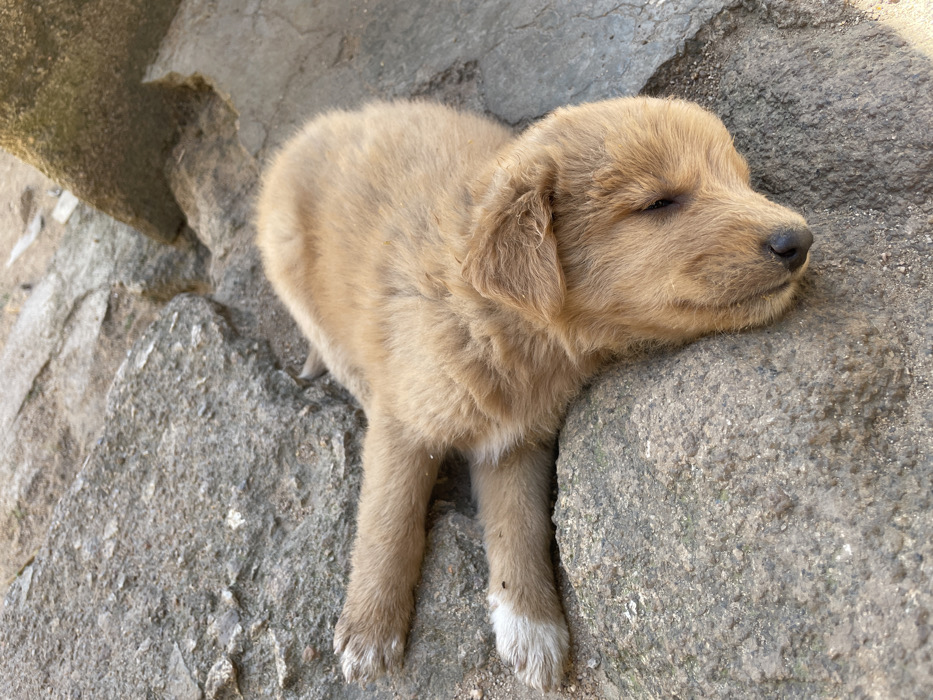 - "A light brown (tan/golden) puppy is observed lying on its left side, asleep on a surface of irregular grey-brown rocks" by FM-KFrzk2, licensed under CC BY 4.0