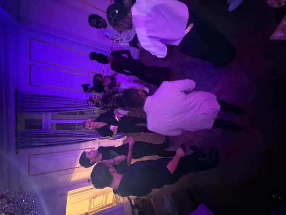 A group of people are gathered indoors, illuminated by blue and white lighting. Several individuals are visible, dressed in formal attire. Some are wearing dark clothing, while others are in white shirts or blouses. The setting appears to be an upscale event or gathering, possibly a party or celebration. The background features ornate walls and windows. The camera angle provides a somewhat skewed perspective of the scene.
