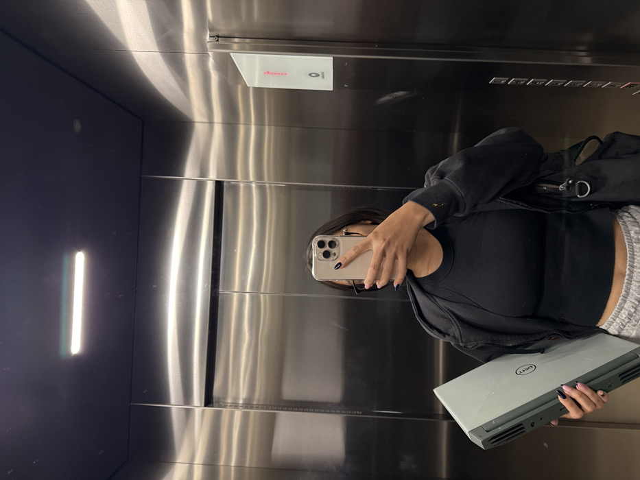 The image displays the interior of a modern elevator in San Andrés Cholula, Mexico. The elevator cabin features walls and doors constructed from brushed stainless steel, exhibiting reflections of the environment and overhead lighting. The ceiling is dark-colored, with a single, centrally positioned horizontal LED or fluorescent light fixture illuminating the space. A white, rectangular control panel is affixed to the right wall, displaying a red digital indicator and a circular button. The word "doli" or "dölü" is visible on the panel below the indicator. A single individual is present, captured in a selfie-style reflection. Their face is partially obscured above the nose by a smartphone, held in their right hand, which is actively taking the photograph. The phone is encased in a clear plastic cover, revealing a multi-lens camera system. The individual has short, dark hair, wears gold-framed eyeglasses, and has dark-painted fingernails. They are dressed in a dark, ribbed sleeveless top, an open dark full-zip hooded jacket or sweatshirt, and light grey sweatpants with an elastic waistband. A dark bag, possibly a tote or backpack, with a metallic D-ring, is slung over their left shoulder. The individual holds a light-grey Dell laptop under their left arm, with the Dell logo clearly visible on the closed lid. The side of the laptop displays ventilation grilles and various ports.