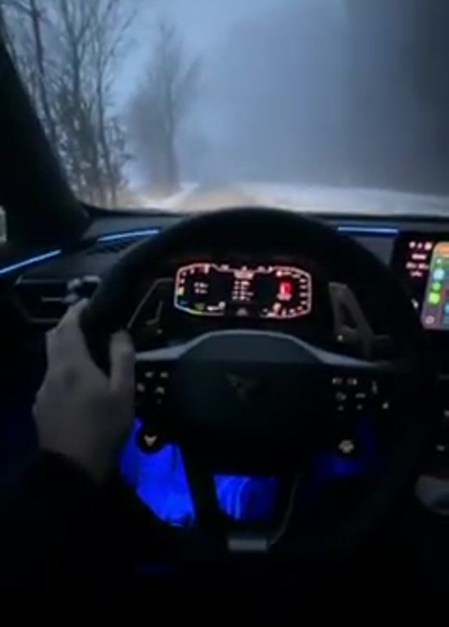 driver's perspective from inside a car driving on a foggy road with some snow on the side. The car's dashboard is visible, featuring a digital display and blue ambient lighting. The driver is holding the steering wheel, and a smartwatch is visible on their left wrist. A navigation app is displayed on the car's screen. The road ahead is obscured by fog, with trees visible on either side. The car is moving forward at a slow speed.