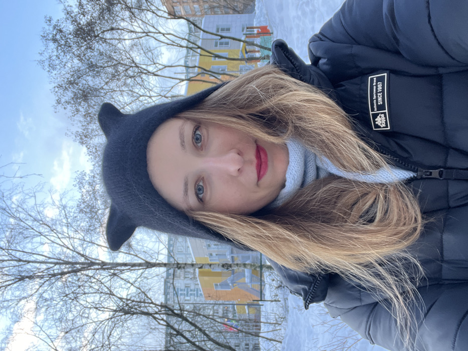 A female subject is depicted in a close-up, chest-up shot against a snowy urban background in Mytishchi, Russia