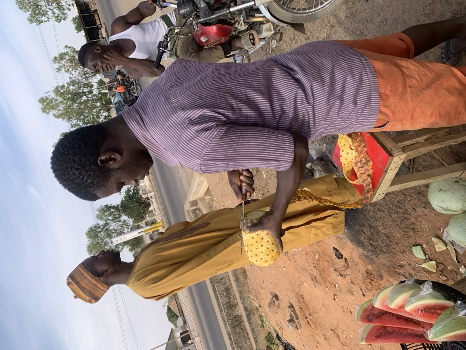Two men stand near a road, one in a yellow robe and hat, the other peeling a pineapple with a knife while wearing a purple striped shirt and orange shorts. A wooden stand holds scraps. Watermelons and other round fruits are nearby. In the background, a man in a white tank top sits on a motorcycle. Trees and buildings are visible in the distance under a bright sky.