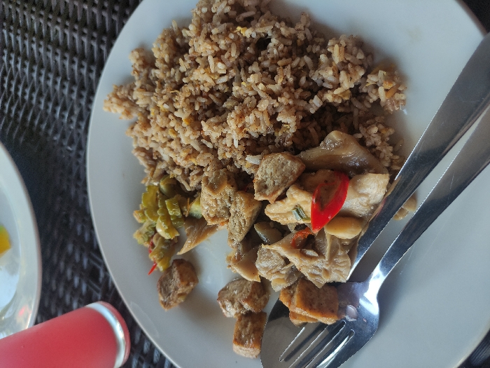 A plate of fried rice, tofu, and vegetables is on a white plate, along with two forks. The plate is sitting on a brown wicker placemat. There is a red liquid in a glass in the lower left corner of the image. The scene is likely in a restaurant or home kitchen, as it appears to be a meal. The food is situated near the center of the plate, with one of the forks positioned to the right of the food. The other fork is on the left side of the food, angled at a 45-degree angle to the plate. The food appears to be ready to eat, and the forks suggest that someone is about to eat the meal. This image was taken at a location in Jember, Indonesia with coordinates -8.172, 113.698.