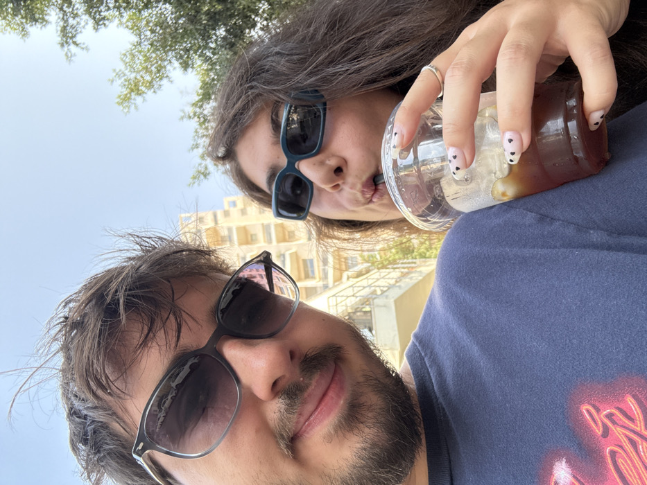 The image displays two individuals, one male and one female, in an outdoor urban setting under a clear sky, consistent with a daytime scene in Tel Aviv, Israel. The male, positioned on the left and partially cropped, has dark hair and a beard, wearing dark-framed sunglasses with dark lenses. He is visible from the chest up, wearing a dark blue t-shirt with a graphic design partially visible. He looks towards the camera with a slight smile. The female, positioned on the right and partially cropped, has long, dark, wavy hair and wears rectangular, dark-teal-framed sunglasses. She is looking towards the camera with her lips pursed, actively drinking from a clear plastic cup containing an iced, dark-colored beverage through a black straw. Her left hand holds the cup; a silver ring is visible on her left ring finger, and her fingernails are painted with a light base and small black heart patterns. In the background, a multi-story, light-colored building with multiple balconies is visible, typical of residential or mixed-use architecture in Tel Aviv. Green foliage from a tree is partially visible on the far right. Reflections in the male's sunglasses suggest the presence of parked vehicles or street infrastructure.