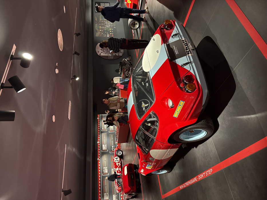 The image depicts an indoor exhibition hall at the Museo Ferrari in Maranello, Italy