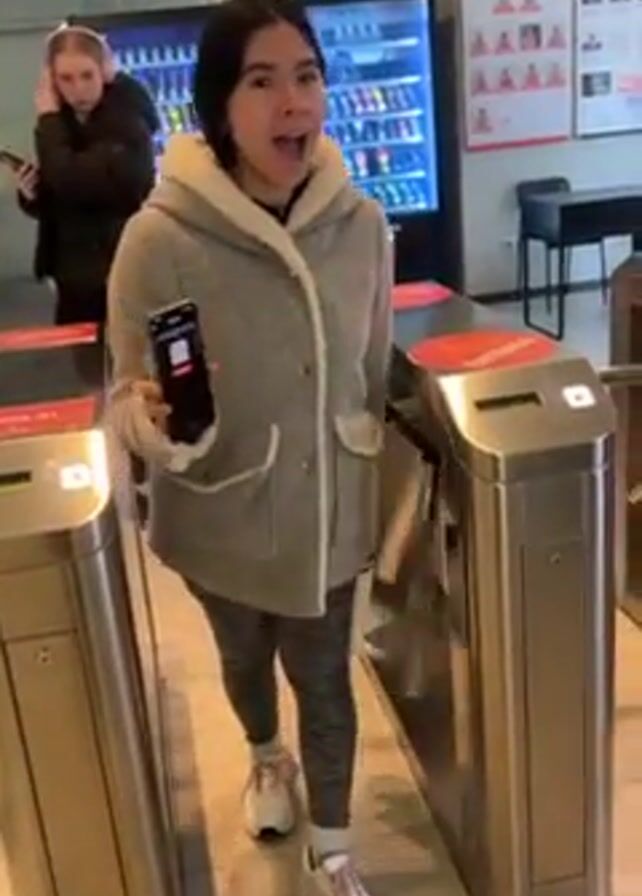 A woman stands between two metal turnstiles in what appears to be the entrance area of a gym or fitness center