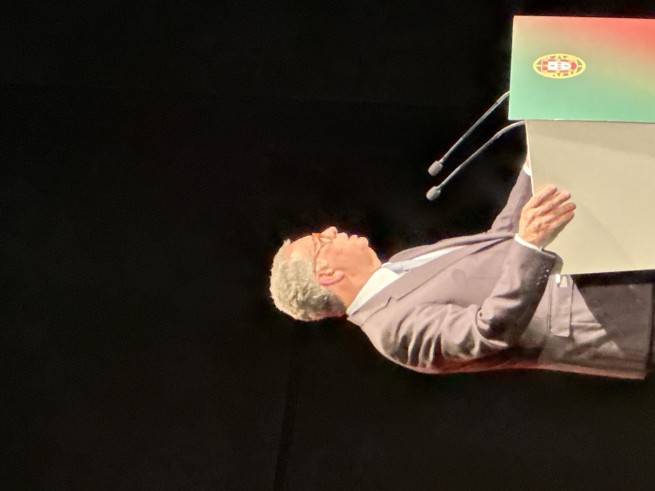An elderly man stands at a podium during a speech. The man has white hair and is wearing a suit. Two microphones extend from the podium. The podium has a green and red logo, with a crest on it. The background is black.