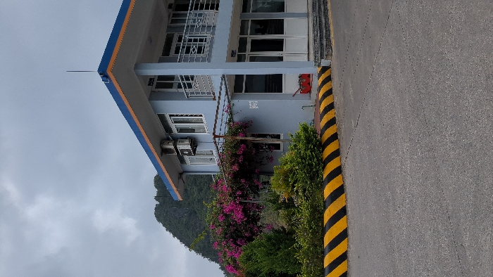 The image displays a two-story, light blue building with a flat roof edged in orange and blue, located in Ha Tu Ward, Vietnam, under an overcast sky. A thin black rod-like antenna extends from the roof's front-right corner. The building features multiple white-framed windows on both levels, two external air conditioning units mounted on the first floor, and a second-story balcony with a light-colored metal railing. On the ground floor, white double doors lead into the structure, approached by concrete steps. A metal-framed awning or pergola structure extends from the left side of the first floor. A dense bush with pink-purple flowers is positioned to the left of this structure, alongside various green shrubs and foliage. A partially visible white rectangular sign or poster is affixed to the first-floor wall. A red object, resembling a fire equipment box or cart, is present near the base of the entrance steps. The immediate foreground is an asphalt surface, bordered by a concrete curb painted with diagonal black and yellow stripes. In the background, a large, tree-covered mountain rises under the grey sky. No people, animals, or explicit actions are visible within the frame.