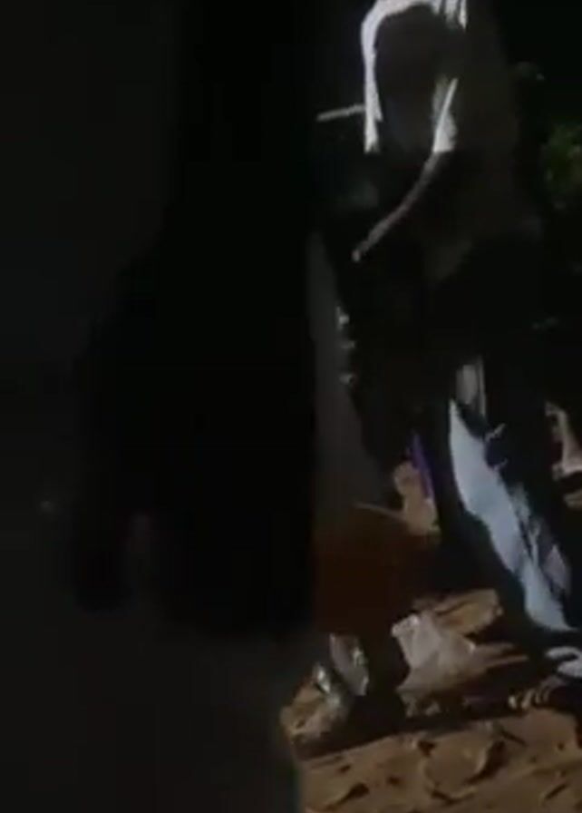 The video appears to have been taken at night in an outdoor setting with poor lighting. Several people are visible, mostly silhouetted against the darkness. One person is wearing a red headscarf and patterned pants. Another person is wearing a white shirt and jeans. People appear to be standing or walking around on what looks like a dirt or sandy surface. It’s difficult to ascertain specific actions due to the low light conditions. What appears to be a table and chairs are visible in the background, as well as additional people.