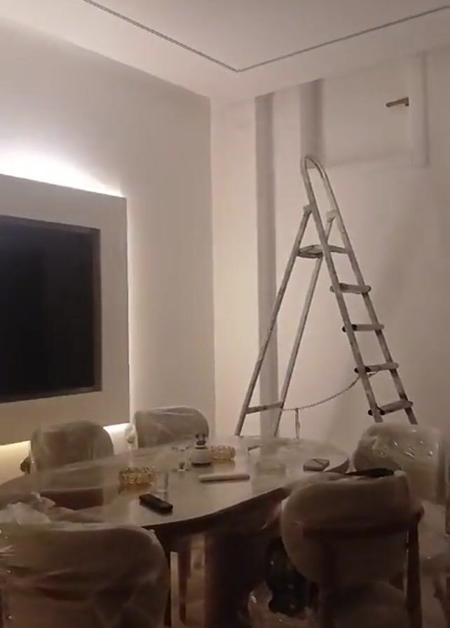 room that appears to be undergoing renovation. The walls are painted white and a ladder is leaning against one of them. There is a table with chairs around it, all covered in plastic wrap. A television is mounted on the wall in the background. The room is brightly lit.