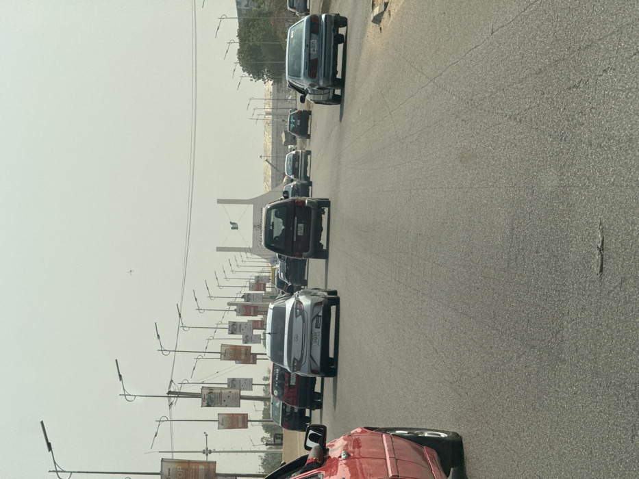 An outdoor, eye-level photograph captures a multi-lane asphalt roadway in Karmajiji, Nigeria, under a hazy, light-colored sky
