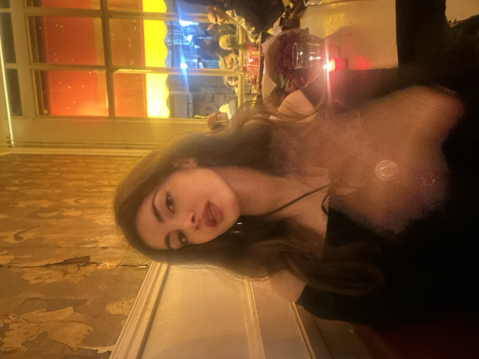 A young woman with long brown hair poses playfully in a dimly lit room