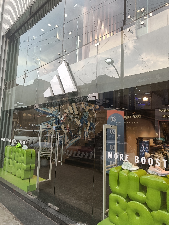 storefront of a Adidas retail store in Bengaluru, India, located at the coordinates 12.974 latitude, 77.607 longitude. The glass storefront is reflecting the sky, the street, and the interior of the store. There is a large Adidas logo featuring three white triangles, and a slogan "More Boost More Energy" is visible on the wall. The interior of the store displays various sportswear and shoes. There are a few people visible in the reflection through the glass, and there is a large green “ULT BOOS” sign featuring a pair of white shoes on top. The sign sits in front of the store entrance. There is a metal ladder leaning against the glass storefront. The exterior of the store is clean and modern.