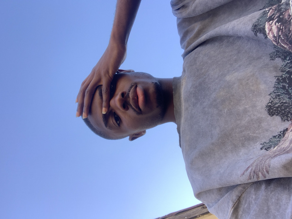 A low-angle shot shows a dark-skinned person against a clear blue sky. The person is partially obscured by a hand held to their forehead, only revealing a dark eye and full lips. The individual has a mustache and short haircut. They wear a gray, possibly vintage-style t-shirt with a faded tree design. The composition is tilted, making the subject appear to be upside down. The lighting is bright and sunny, highlighting the textures in the clothing and skin.