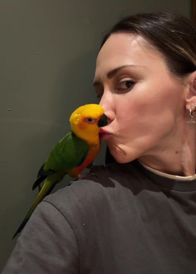 A woman with dark hair pulled back, wearing a gray t-shirt, stands close to the camera. On her shoulder is a small, colorful bird, a Sun Conure. The bird has bright yellow head and chest feathers blending into orange, transitioning to green on its wings and tail. The bird nudges its beak against the woman's cheek multiple times, seeming affectionate. The background is a muted gray wall with a framed picture hanging partially visible in the upper right corner.