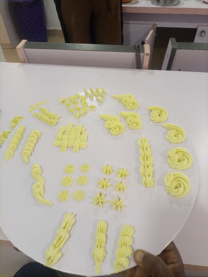 A dark-skinned individual's hand in the bottom right holds a white circular board, approximately 40-50 cm in diameter. The board is covered with numerous samples of yellow piped frosting, demonstrating various cake decorating techniques. These include rosettes, shell borders, braided patterns, woven basketweave, various star and flower shapes, and ruffled lines, arranged in distinct clusters across the surface. In the upper background, a person wearing brown trousers stands behind a light-colored counter with a dark green edge. A purple, textured cylindrical bin is visible in the upper left background, and a metal chain hangs in the upper center. The scene is an indoor, well-lit environment, likely a kitchen, bakery, or culinary workshop in Unknown, Unknown.