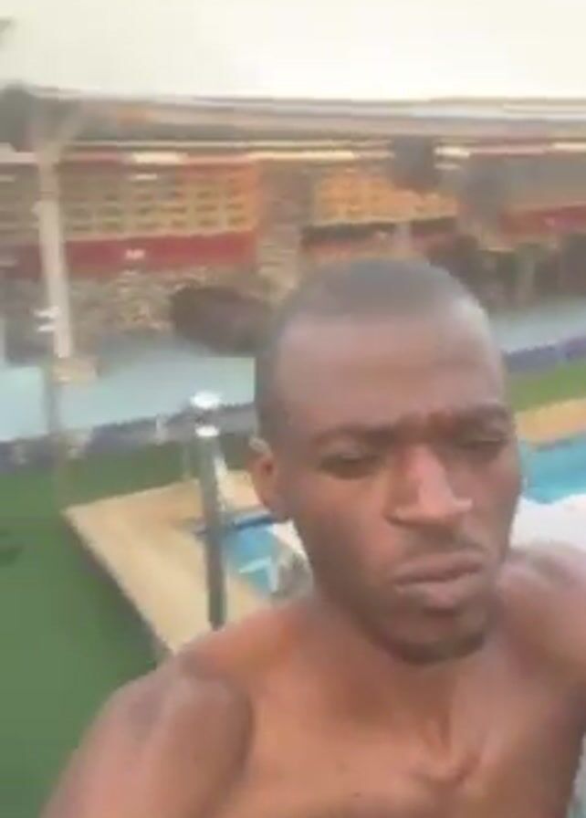 A shirtless Black man makes gestures and facial expressions toward the camera in what appears to be a selfie video