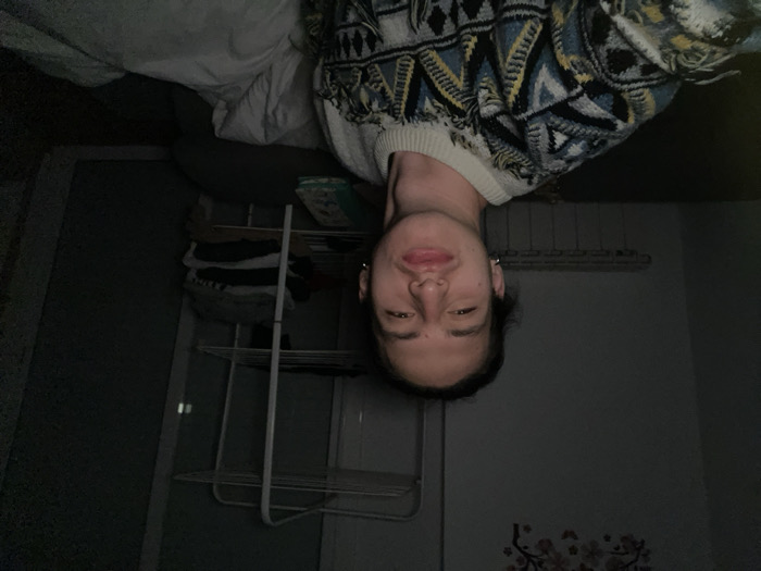 An upside-down view captures a person wearing a patterned sweater. They are near a bed, which is visible in the upper portion of the image. In the background, there is a white metal shelving unit and a floral design on the wall near the bottom corner. The lighting is dim, casting shadows and affecting the clarity of the scene.